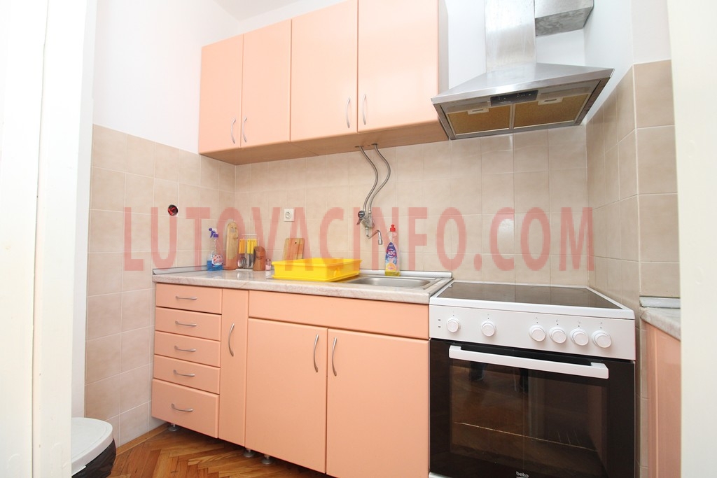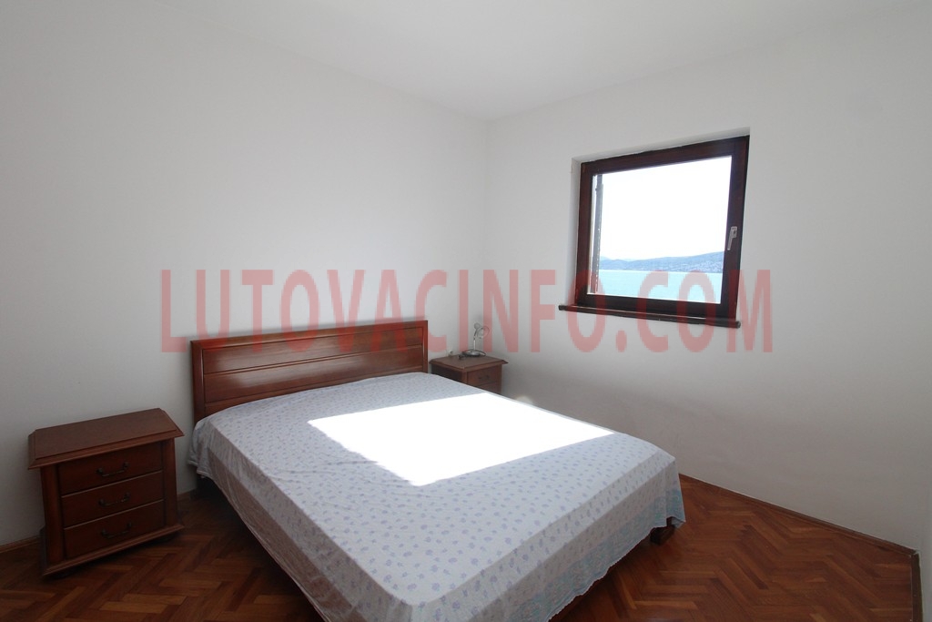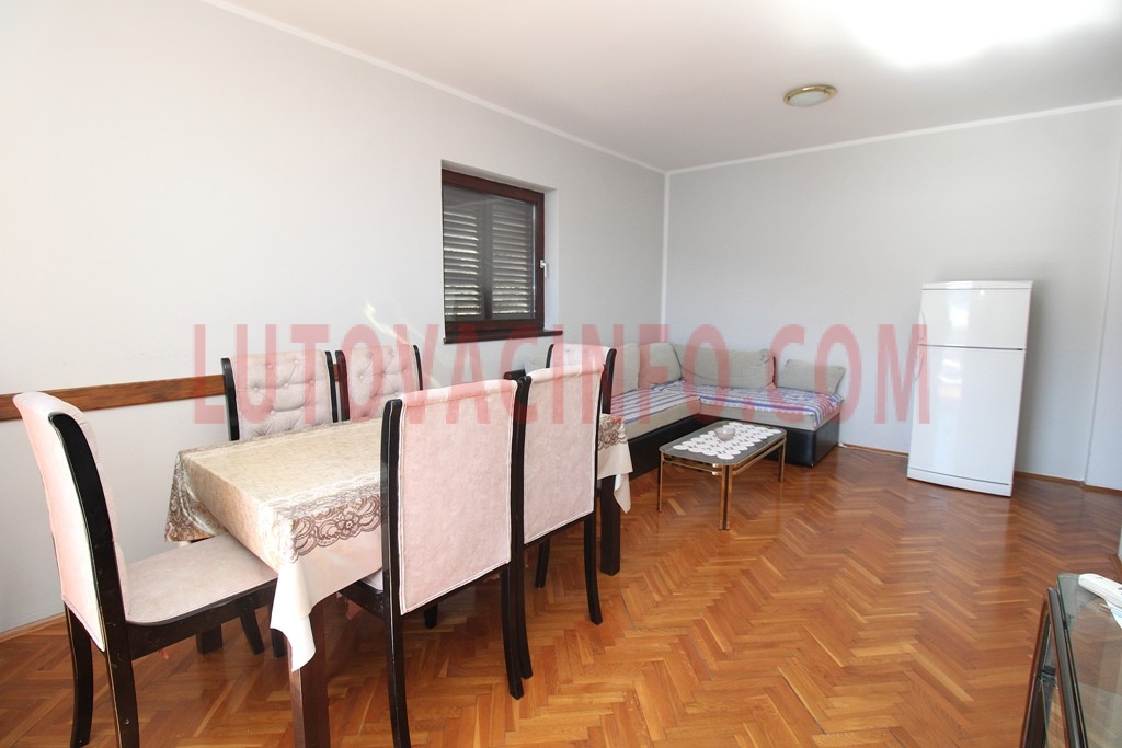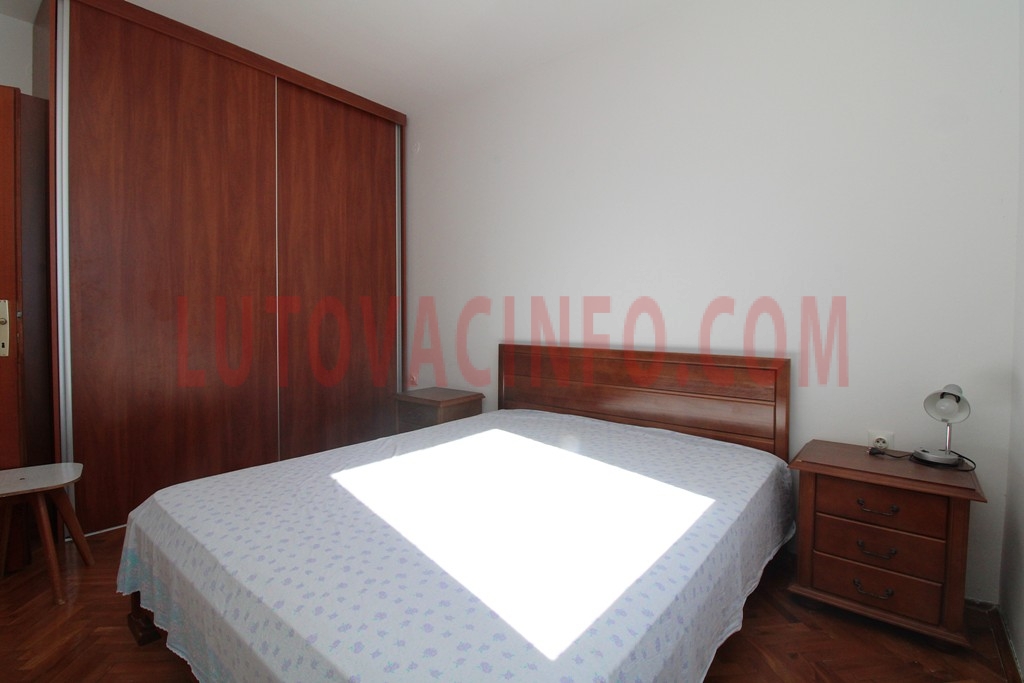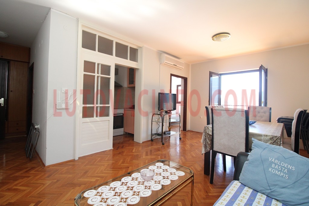Raspored prostorija: ulazni hodnik,kupatilo,dnevni boravak sa kuhinjom,dvije spavaće sobe i velika terasa sa prelijepim i trajnim pogledom na more.